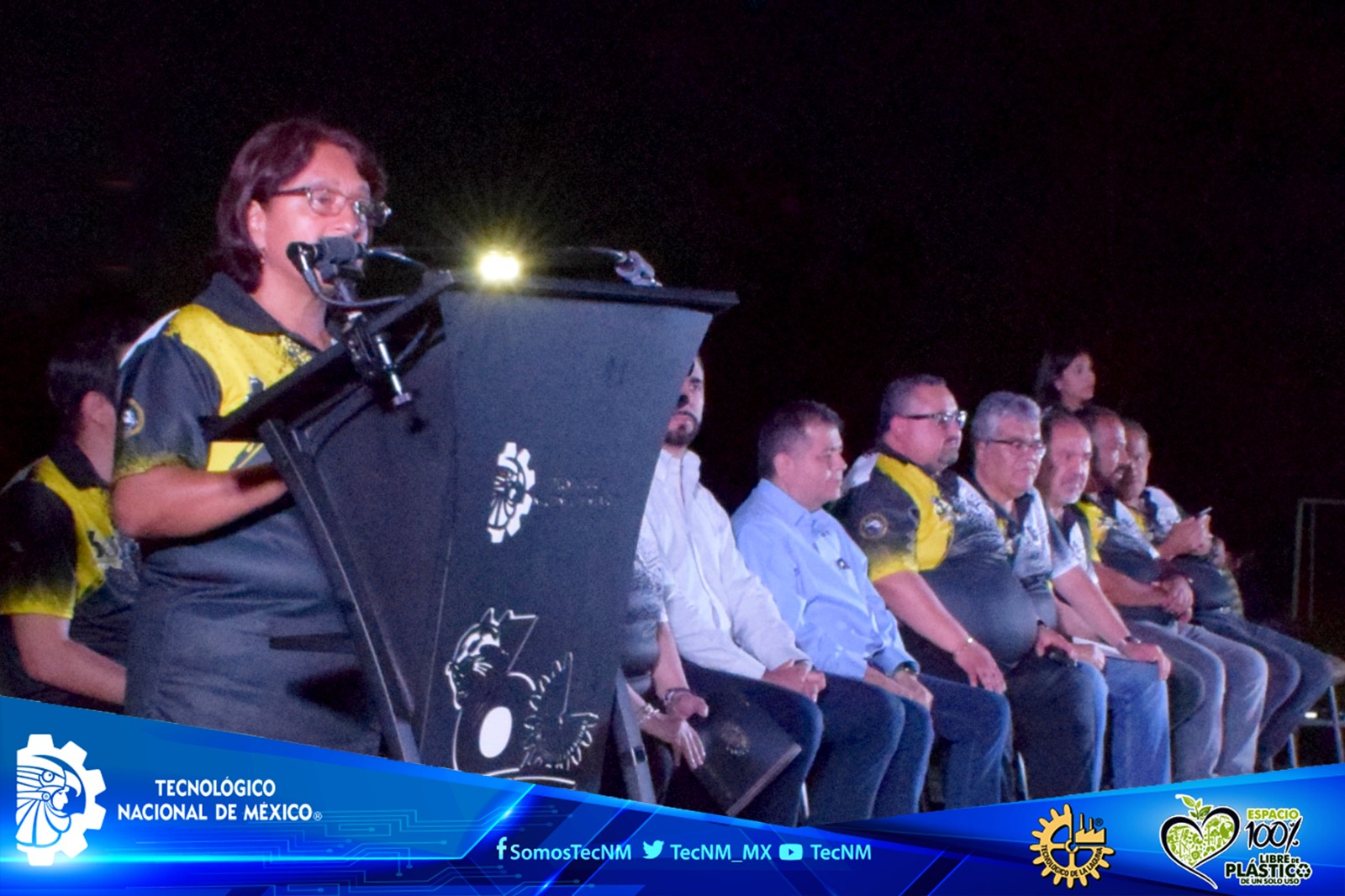 Luego, la Coordinadora de Promoción Cultural y Deportiva del TecNM, se dirigió a las y los asistentes, a quienes les extendió el saludo de nuestro director general del TecNM, el profesor Ramón Jiménez López, y de la maestra Andrea Zárate, secretaria de Extensión y Vinculación.