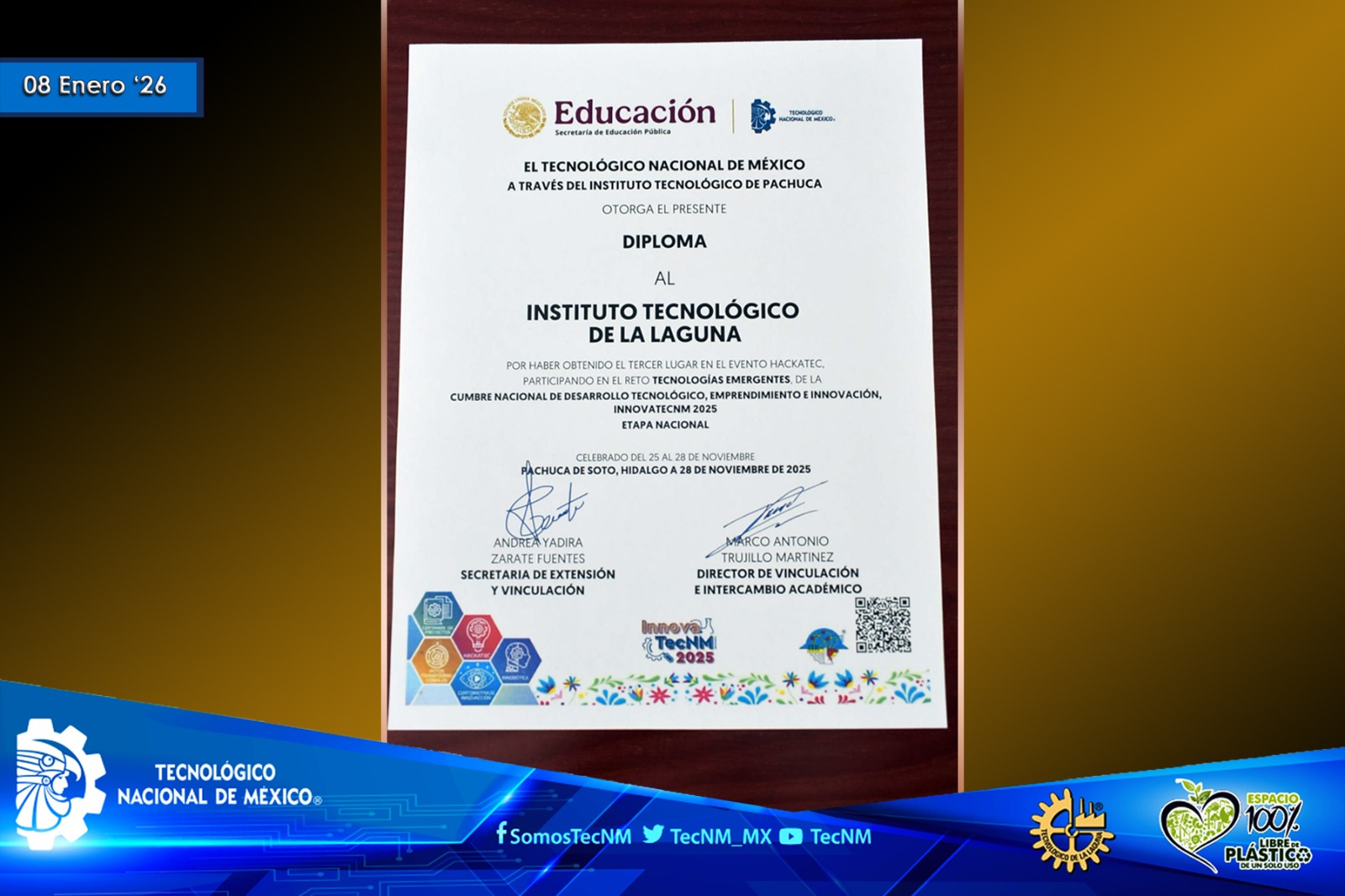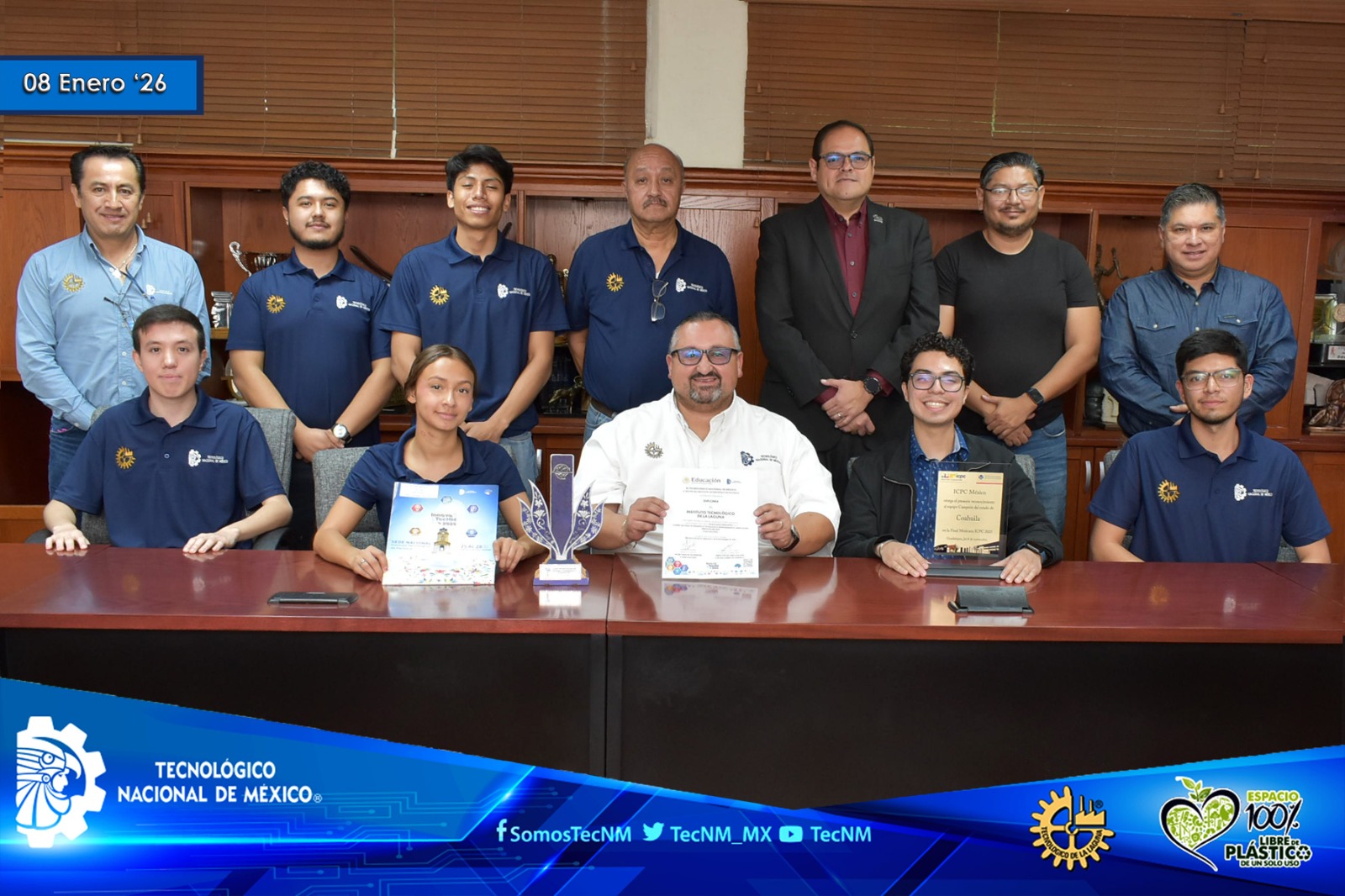 En un gesto de orgullo institucional, ambos equipos entregaron a nuestra casa de estudios los reconocimientos oficiales obtenidos por su exitosa participación. Dichos galardones fueron recibidos por el director y ahora lucen en el pabellón del honor de la sala de juntas de dirección, como símbolo tangible del esfuerzo, disciplina y talento de nuestra comunidad tecnológica.