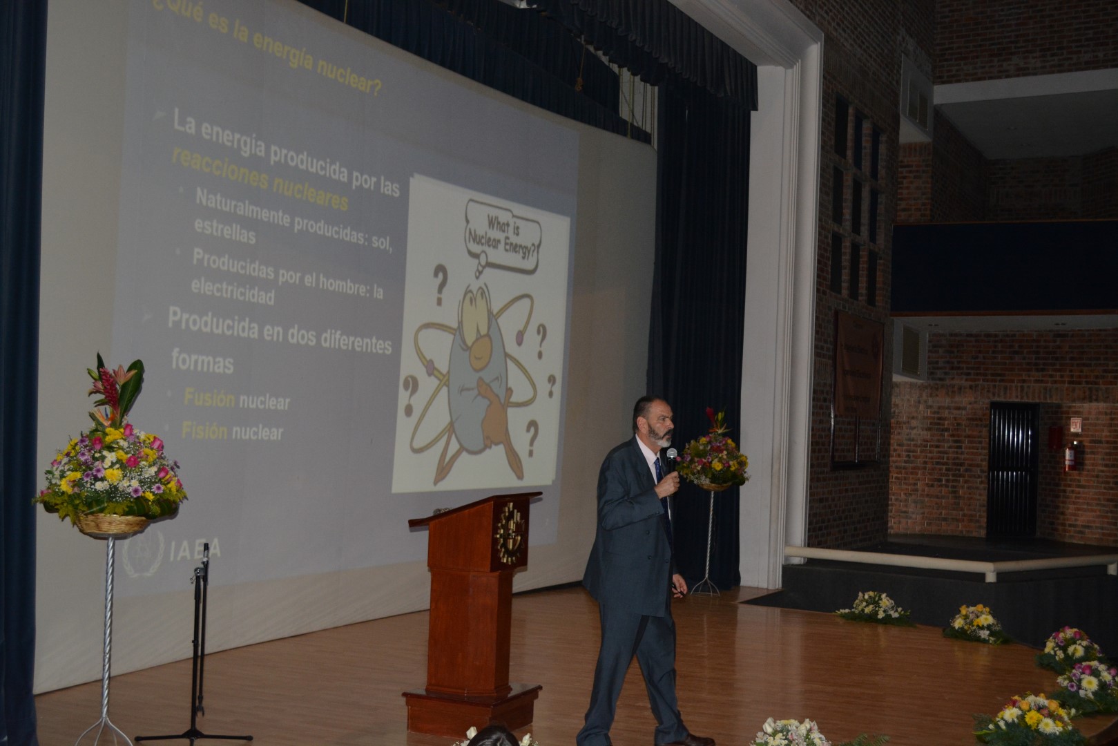 Desmitificando el uso de la energía nuclear, el Dr. Longoria Gándara dedica parte de su tiempo a impartir conferencias explicando a los estudiantes los diferentes usos de la energía nuclear en el sector salud, en la agricultura, medio ambiente y no solo para realizar bombas, como comúnmente se cree.