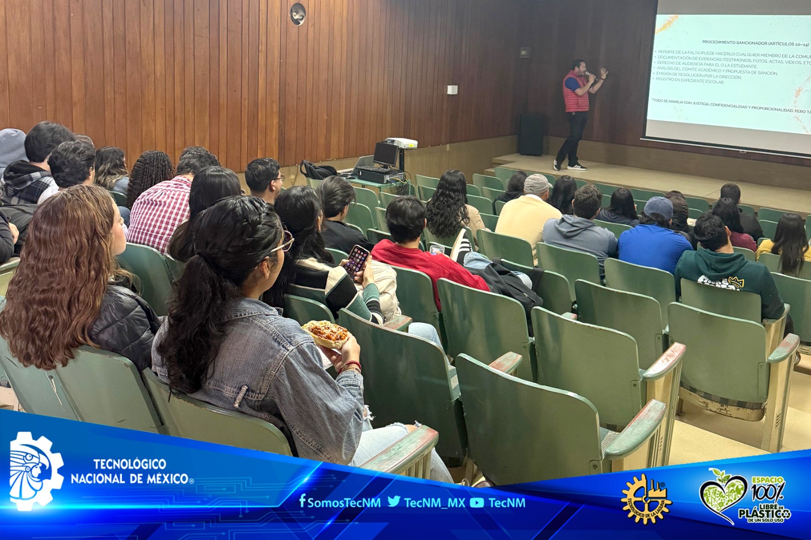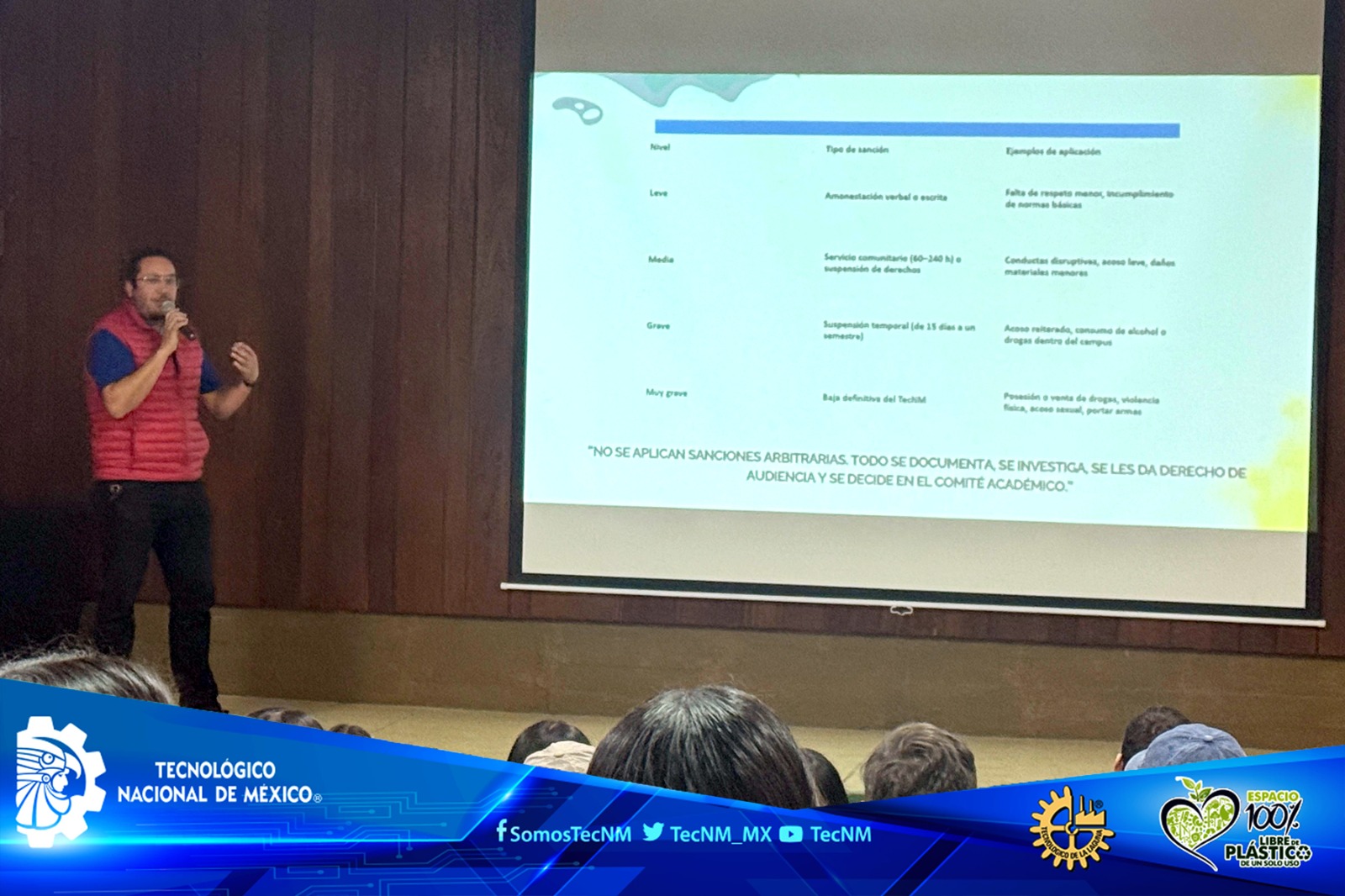Durante esta jornada, se ofrecieron pláticas informativas a todos los grupos de las cuatro carreras del departamento, en la Sala García Siller. En ellas se abordaron los principales puntos del Reglamento de Estudiantes del TecNM y el Tabulador de Sanciones, con el propósito de prevenir conductas de riesgo, fortalecer los valores institucionales y brindar acompañamiento ante cualquier situación que afecte la integridad o el desarrollo académico de las y los estudiantes.